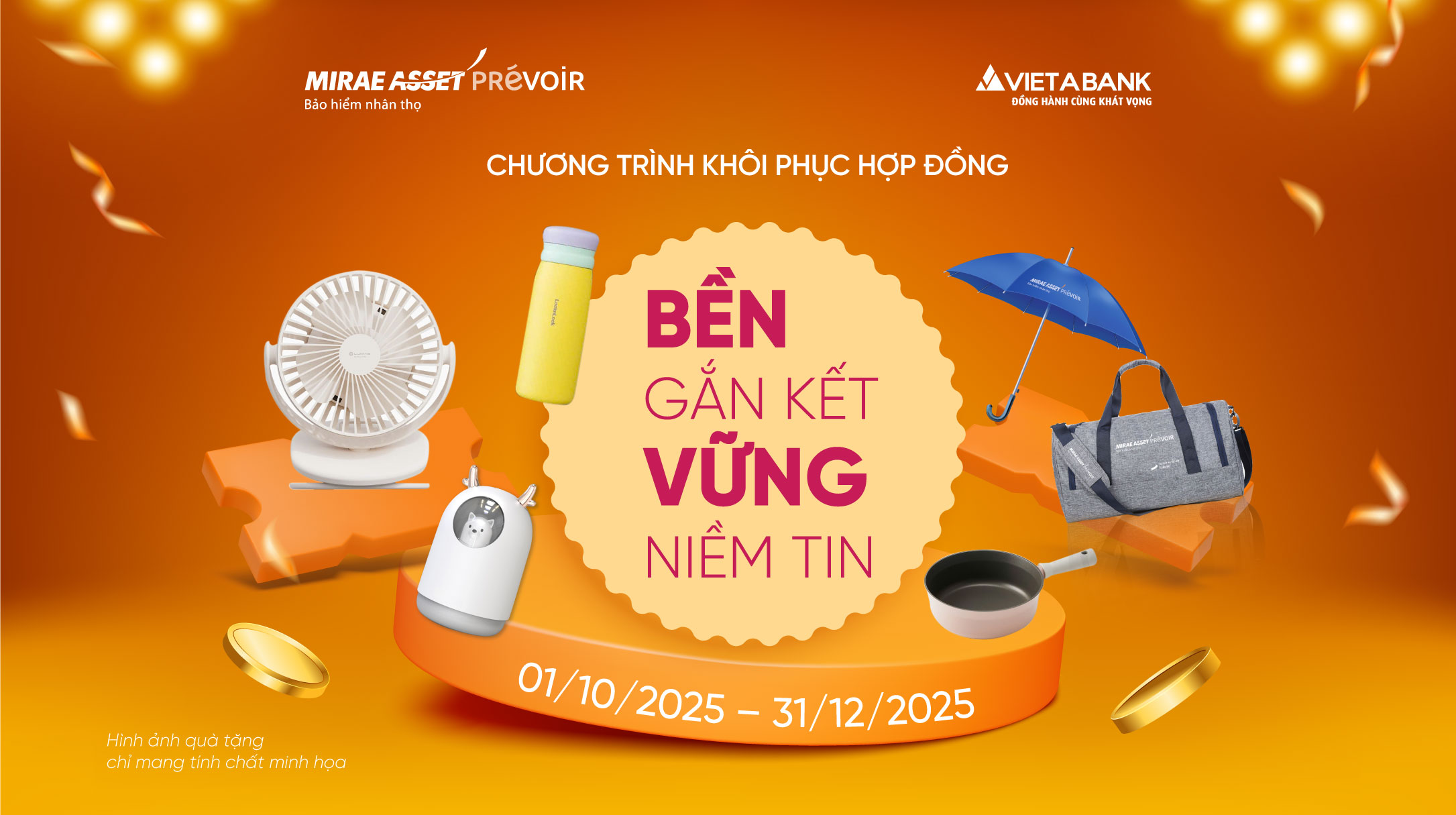 Với mong muốn luôn được gắn kết cùng Quý khách hàng trong hành trình cuộc sống, Công ty TNHH Bảo hiểm Nhân thọ Mirae Asset Prévoir xin trân trọng gửi tới Quý khách chương trình khuyến mại “Thu đồng hành – Trọn tin yêu” cùng nhiều phần quà tặng hấp dẫn. Nhưng hơn cả những món quà trao tay, đây là lời tri ân chân thành từ Mirae Asset Prévoir gửi đến Quý Khách hàng đã luôn tin tưởng và đồng hành cùng Công ty trong suốt thời gian qua.